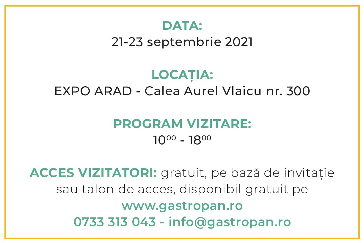 În doar câteva săptămâni începe expoziția GastroPan, cel mai important eveniment autohton din domeniul panificației, al cofetăriei și al ospitalității. Expoziția se va desfășura în intervalul 21-23 septembrie 2021, în orașul Arad. Vă așteptăm la Expo Arad în perioada 21-23 septembrie 2021!